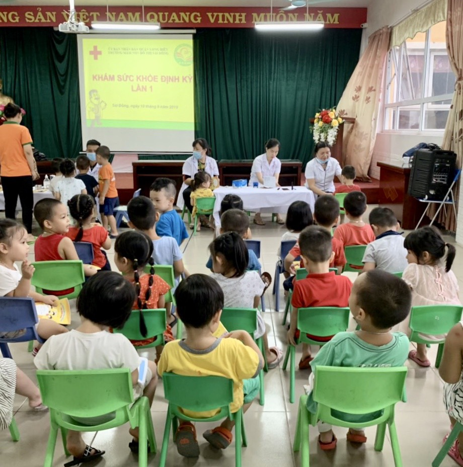 Trường Mầm non Đô thị Sài Đồng phối hợp với các bác sĩ của Trung tâm y tế Quận Long Biên tổ chức khám sức khỏe định kỳ lần thứ nhất trong năm học 2019-2020 cho 100% trẻ