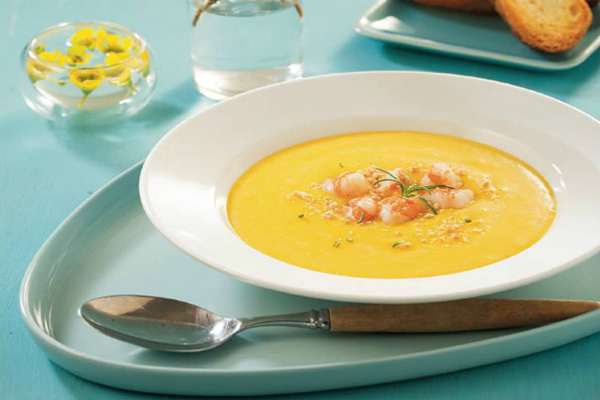 Đổ bí đỏ đã xay nhuyễn vào nồi bắt lên bếp nấu sôi, sau đó cho tôm vào súp. Nấu đến khi tôm chín cho sữa tươi và bơ phe, kem tươi vào nồi súp và nhớ khuấy đều.