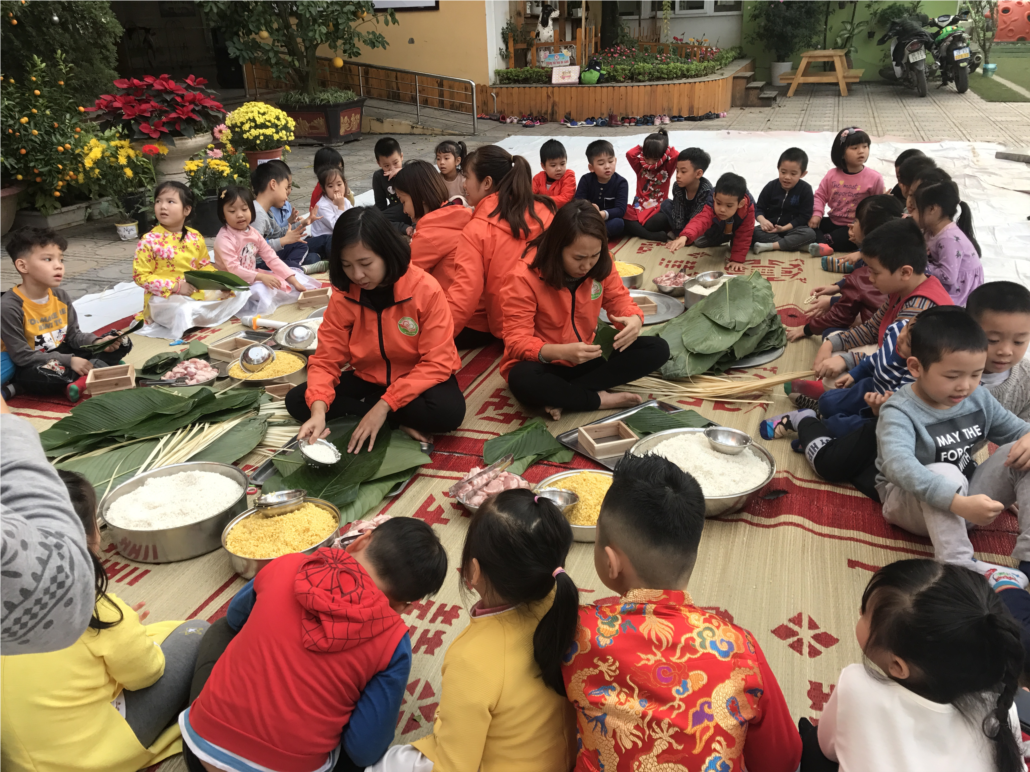 Trước khi bắt tay vào làm, các bé được cô giáo kể cho nghe câu chuyện "Sự tích bánh chưng" và hướng dẫn đầy đủ các bước làm. Bé nào cũng được tự tay gói và thả bánh chưng của mình vào nồi nước luộc. Các bé tỏ ra rất thích thú và hào hứng khi được học hỏi thêm về phong tục Tết cổ truyền của dân tộc, tự tay làm một món ăn truyền thống đặc trưng của ngày Tết.
