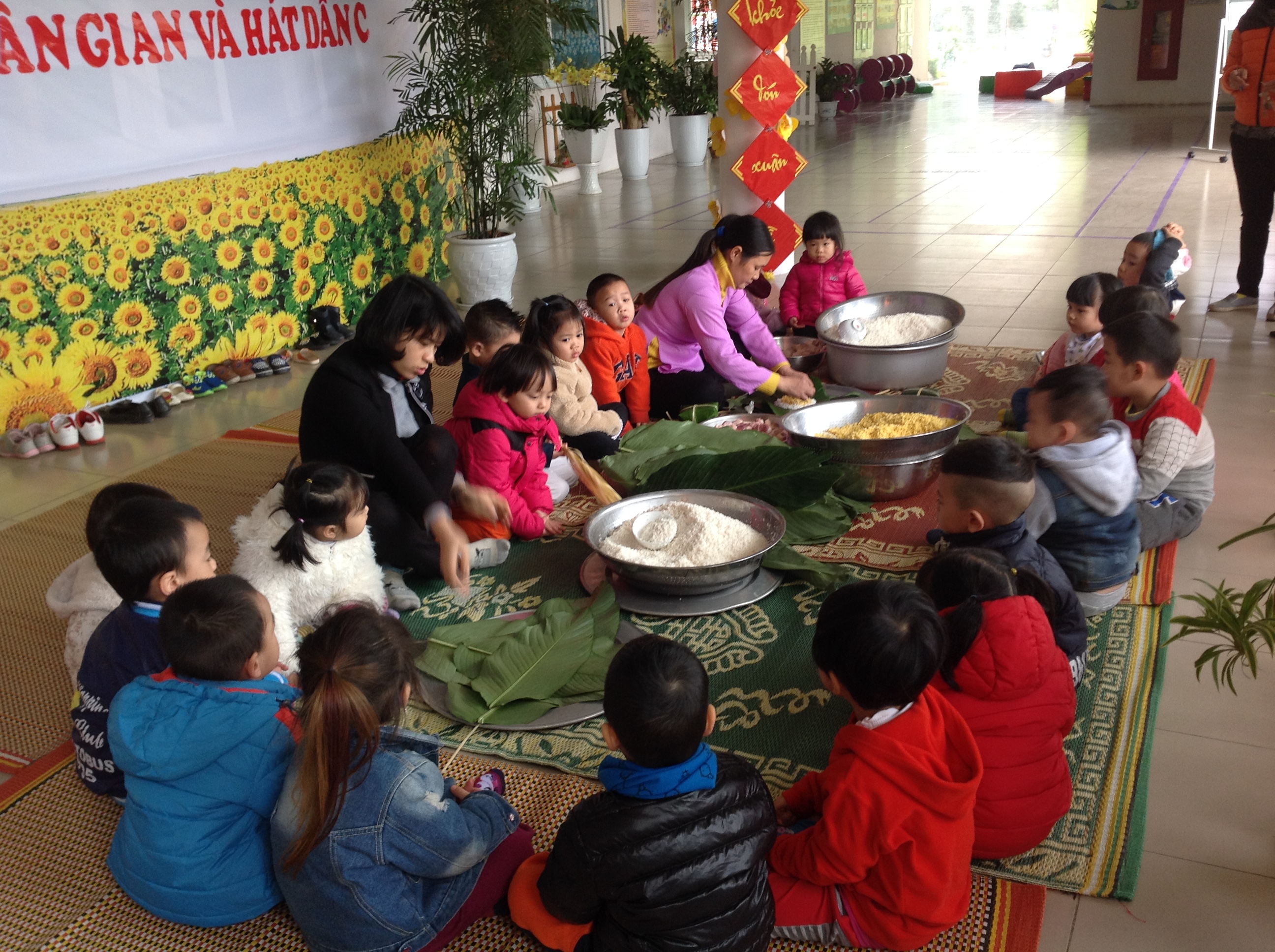Cô và các bé cùng gói bánh chưng
