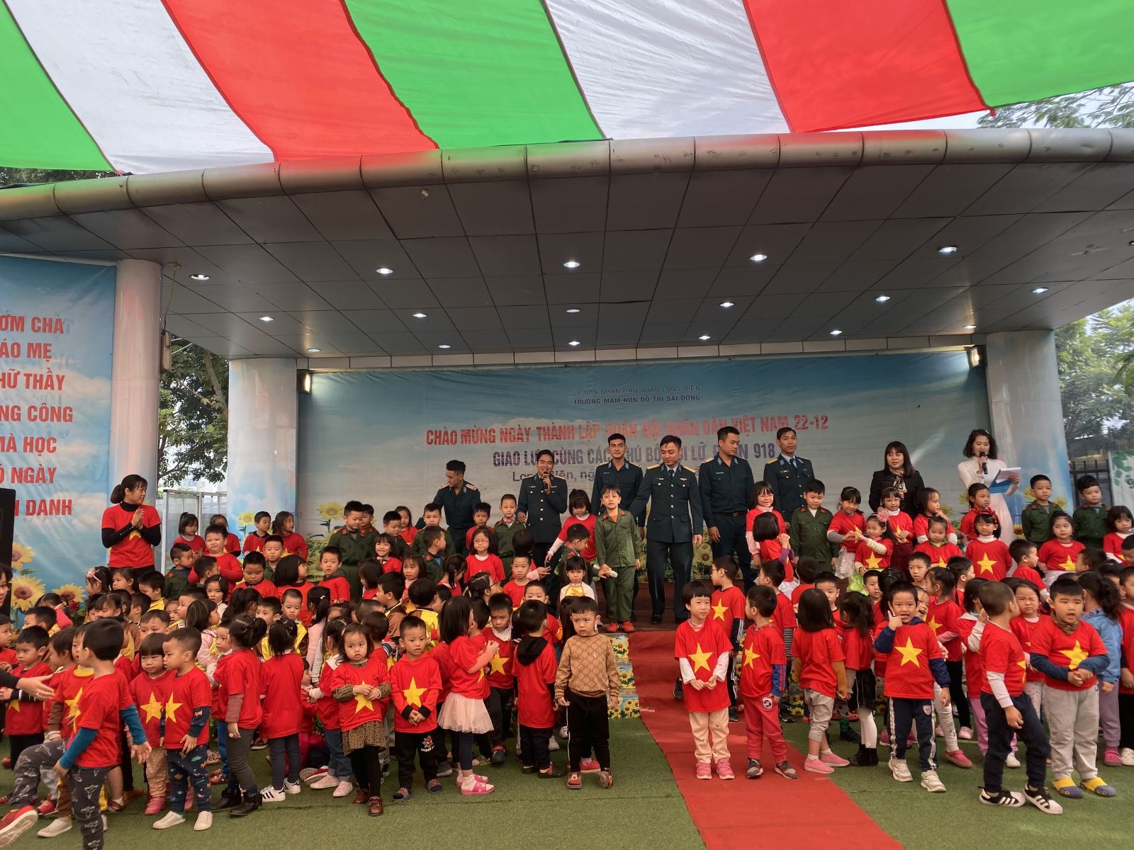 Các bé Trường Mầm non Đô Thị Sài Đồng được nghe các cán bộ, Chiến sĩ chia sẻ về tên tuổi, đơn vị và công việc của các chú. Buổi giao lưu Không chỉ có những tiết mục văn nghệ của cô, trò và các cán bộ chiến sĩ mà các bé hào hứng quan sát phần thực hiện gấp chăn màn, quần áo, Đi duyệt binh và được các chú hướng dẫn cách đi, cách gấp chăn màn,...