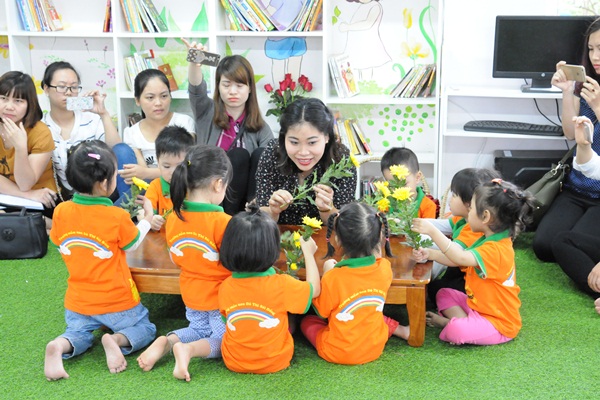 Không chỉ dự hoạt động học mà đoàn kiến tập đã tìm hiểu và tham quan môi trường lớp học, cảnh quan sư phạm của nhà trường, cùng chia sẻ kinh nghiệm xây dựng môi trường học tập thân thiện, sáng tạo cho trẻ.