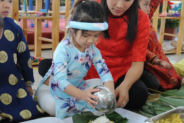 Trước khi bắt tay vào làm, các bé được các cô kể cho nghe câu chuyện "Sự tích bánh chưng" và hướng dẫn đầy đủ các bước làm. Bé nào cũng được tự tay gói và thả bánh chưng của mình vào nồi nước luộc. Các bé tỏ ra rất thích thú và hào hứng khi được học hỏi thêm về phong tục Tết cổ truyền của dân tộc, tự tay làm một món ăn truyền thống đặc trưng của ngày Tết.