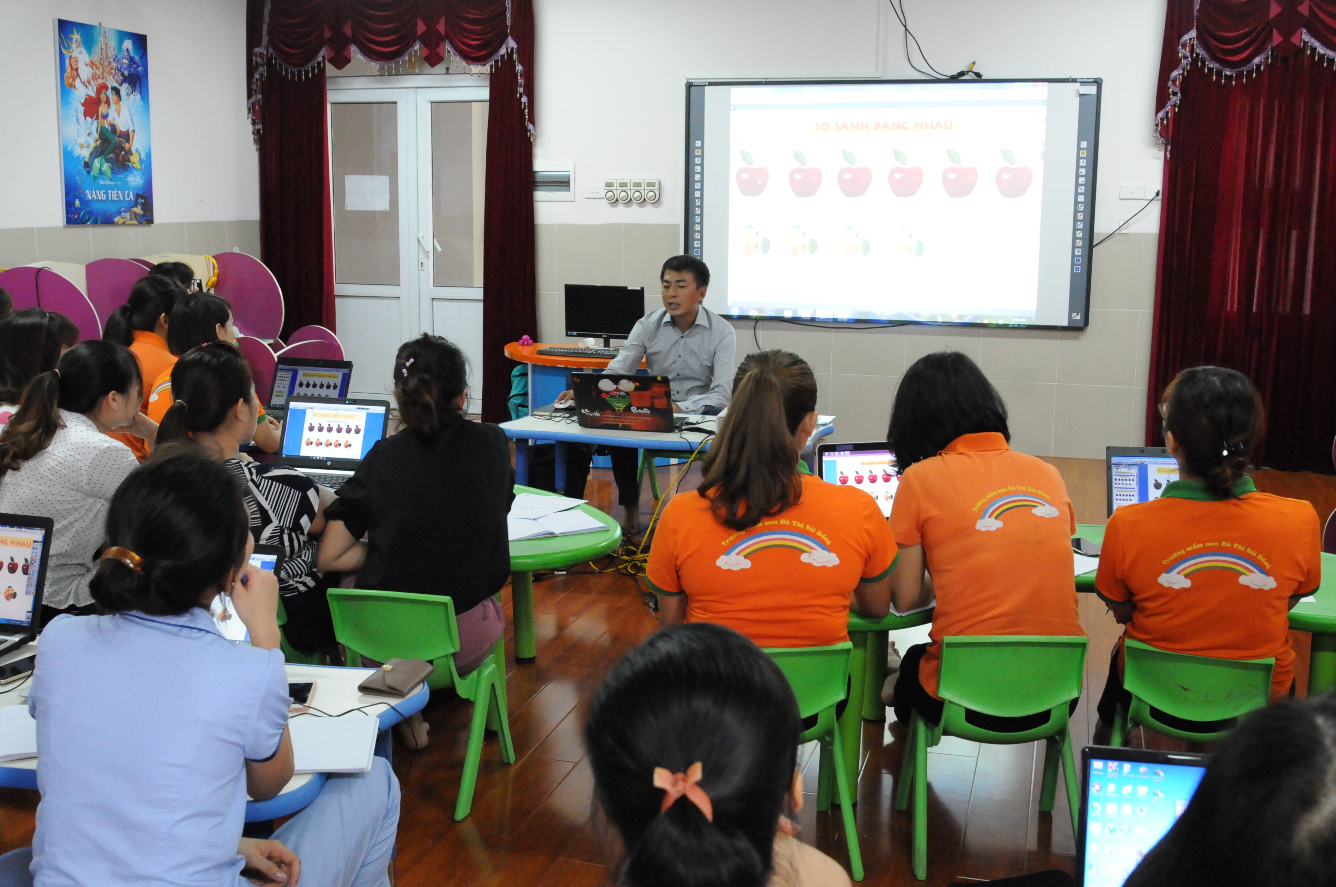 Các cô giáo rất nghiêm túc tham gia buổi tập huấn và đã tự mình sử dụng bảng tương tác để thiết kế bài giảng. Đây là một cách thức dạy học thú vị, phong phú, rất hữu ích và phù hợp với giáo viên, phục vụ tốt cho công tác giảng dạy và giáo dục trẻ nhằm đạt được những kết quả tốt nhất.