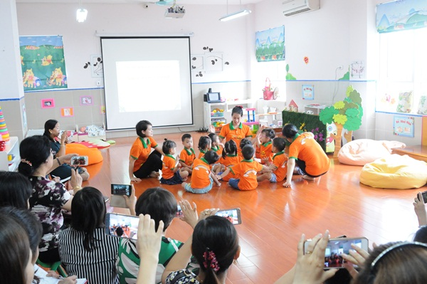 Tiết Giáo dục thể chất với chủ đề “Bật về phía trước” dành cho lớp mẫu giáo bé (trẻ từ 3-4 tuổi) do cô giáo Lương Thị Hảo phụ trách. Nhờ sự hướng dẫn nhiệt tình, dễ hiểu và rất sinh động từ cô Hảo, các bé mạnh dạn tham gia vào các trò chơi, các hoạt động khác nhau trong tiết học, đặc biệt hoạt động trải nghiệm pha màu nước.