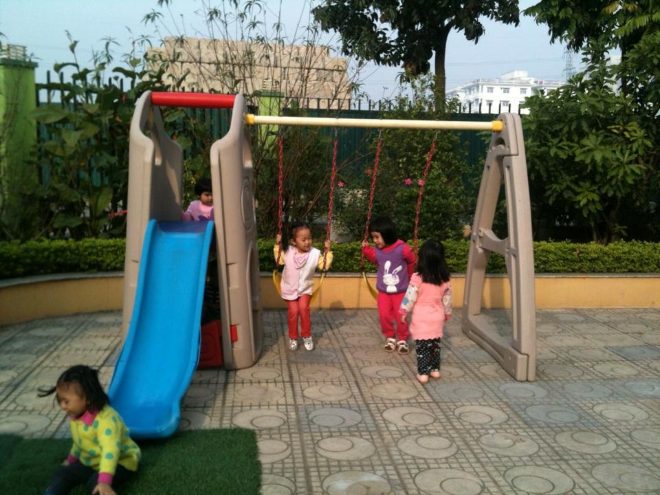 Hoạt động sáng các con được các cô đón ngay tại sân trường, các con được vui chơi với các đồ chơi trong sân: đu quay, cầu trượt, đi xe đạp đi cà kheo..., những hoạt động đó vừa giúp các con tỉnh táo hơn, vừa giúp các con tăng cường hấp thu canxi, vừa giúp các con có tinh thần đoàn kết, biết chơi với bạn.
