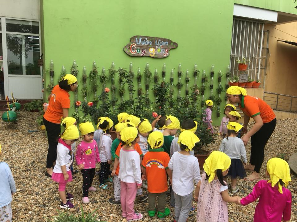 Cô và các bé lớp Nhà trẻ D1 đang chăm sóc vườn ươm đấy các bạn ạ!