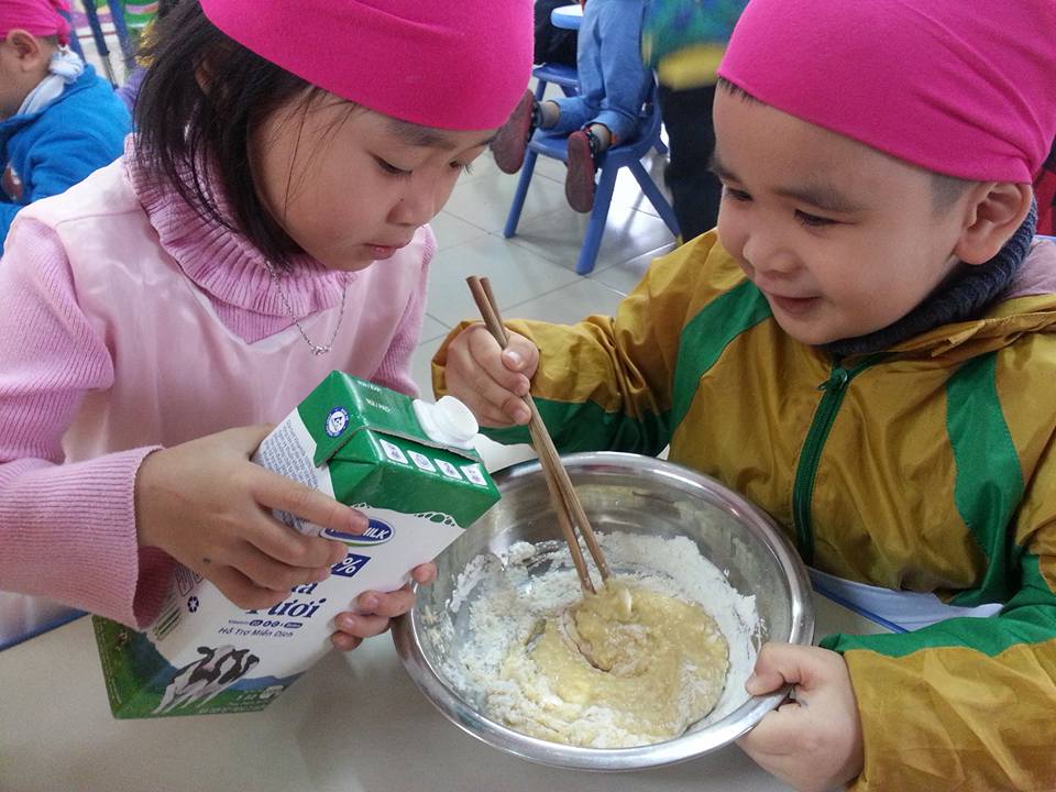 Các bé đang trộn bột