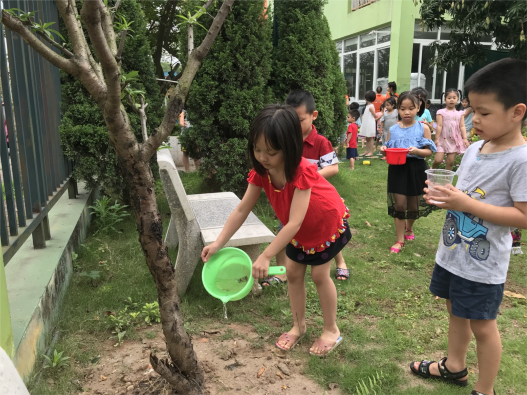 Trong các giờ học như hoạt động ngoài trời, hoạt động góc, hoạt động học… ngoài việc cho các bạn nhỏ thu dọn đồ dùng học tập, lau dọn các góc chơi, các cô còn tổ chức cho trẻ nhặt rác ở bồn hoa, tưới cây, lau lá.