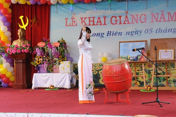 Đ/c Trần Thị Phương Dung - Bí thư chi bộ đánh trống khai giảng năm học mới