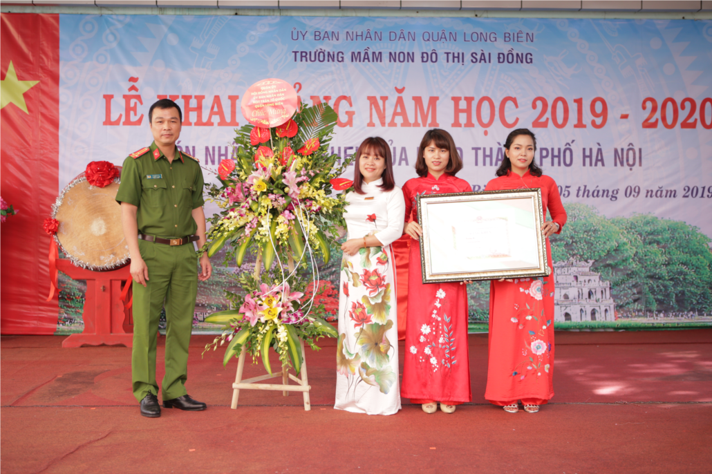 Thượng tá: Tô Anh Dũng- Ủy viên ban thường vụ Quận ủy- Bí thư Đảng ủy- Trưởng công an Quận Long Biên trao bằng khen của UBND Thành Phố Hà Nội và tặng hoa chúc mừng nhà trường.