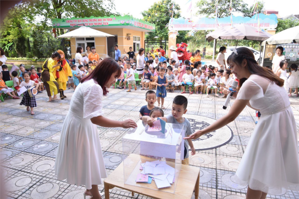 Phần cuối chương trình, các bé học sinh được tự tay bỏ vào hòm những chiếc phong bì do chính các bé làm và trang trí, dành dụm một số tiền nho nhỏ để giúp đỡ các bạn nhỏ có hoàn cảnh khó khăn phường Sài Đồng. Đây không chỉ đơn thuần là buổi quyên góp, ủng hộ, mà nó còn thể hiện tấm lòng “Lá lành đùm lá rách”, giúp trẻ học cách san sẻ sự quan tâm bằng tình yêu thương với những bạn có hoàn cảnh kém may mắn khác ngay từ thuở còn thơ.