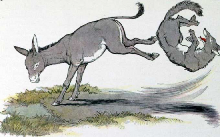 Trong một khu rừng nọ, có một con lừa đang vui vẻ ăn cỏ trên một ngọn đồi mà không hề hay biết rằng có một con sói đang rình nó. Khi con lừa ăn xong và ngẩng đầu lên, nó ngỡ ngàng nhận ra con sói đang đứng nhìn mình. Con lừa biết rằng mình phải suy nghĩ nhanh nếu muốn tự cứu lấy bản thân. Nó bắt đầu hét lên như thể mình đang bị thương rất nặng. Nghe tiếng hét, con sói không hiểu chuyện gì đang xảy ra nên nó đã tiến lại gần và hỏi: