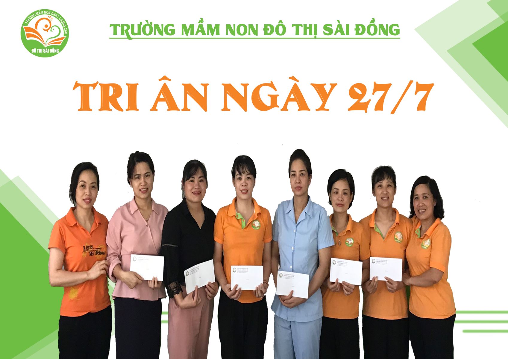 Hôm nay, ngày 27/7 nhân dân cả nước đã giành riêng để tưởng nhớ các anh hùng liệt sĩ đã ngã xuống hy sinh vì đất nước, vì độc lập tự do. Các anh ra đi vì những mục tiêu cao đẹp và ngã xuống hào hùng và oanh liệt. Để tỏ lòng biết ơn sâu sắc đến các anh, Ban chấp hành công đoàn trường mầm non Đô thị Sài Đồng có chút quà thăm hỏi động viên các gia đình CBGVNV là gia đình liệt sỹ. Đó là đạo lý “Uống nước nhớ nguồn” của dân tộc Việt Nam chúng ta .Hãy cùng tưởng niệm các anh hùng dân tộc.