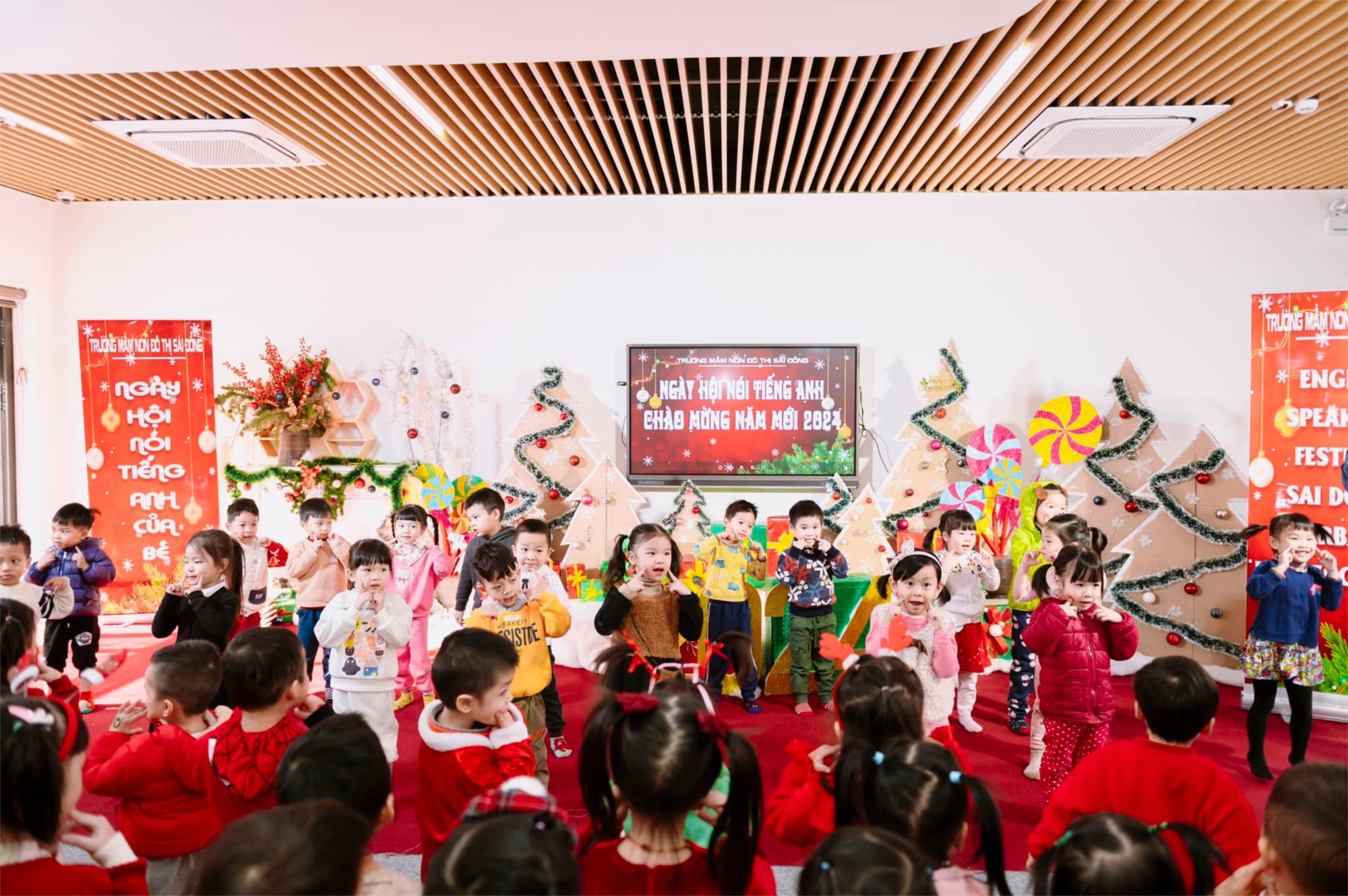 Hiểu rõ được điều đó, trường mầm non CLC Đô Thị Sài Đồng luôn quan tâm đến việc bồi dưỡng và phát triển khả năng tiếng Anh cho các bé học sinh, coi tiếng Anh là một trong những môn học “mũi nhọn”, là đầu tư hàng đầu trong chương trình đào tạo của Nhà trường. Nhằm tạo điều kiện, cơ hội cũng như sân chơi bổ ích thông qua việc tham gia các trò chơi, biểu diễn các tiết mục bằng tiếng Anh giúp các bé học sinh tự tin trong việc sử dụng Tiếng Anh và giao tiếp với người bản ngữ, chiều ngày 20/12 Trường mầm non CLC Đô Thị Sài Đồng đã tổ chức “Ngày hội Tiếng Anh – English festival day” cho học sinh với chủ đề “Happy new year – Chào mừng năm mới 2024”.