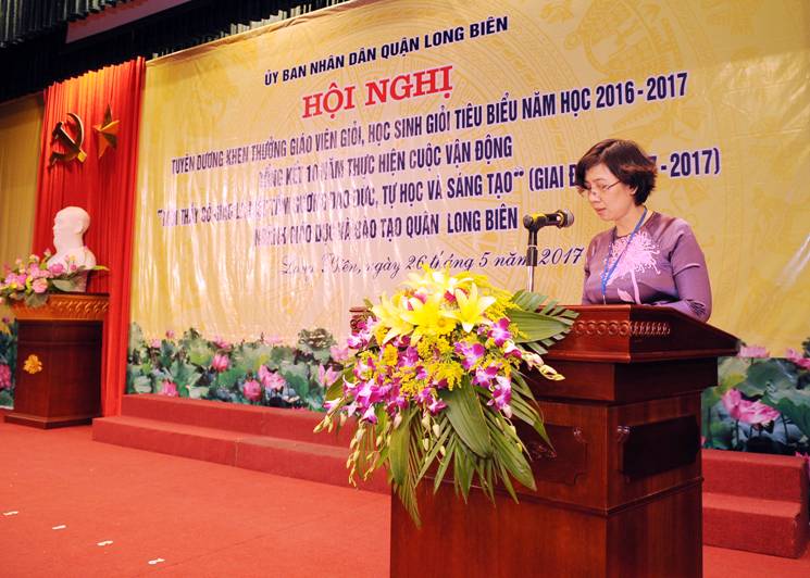 Tại buổi lễ, đồng chí Vũ Thị Thu Hà – Trưởng phòng GD&ĐT đọc báo cáo tổng kết và tuyên dương khen thưởng giáo viên giỏi, học sinh giỏi tiêu biểu năm học 2016-2017. Với tinh thần đổi mới căn bản toàn diện GD&ĐT, để hoàn thành tốt nhiệm vụ năm học, ngay từ đầu năm học, bám sát sự chỉ đạo của Sở GD&ĐT, QU-HĐND-UBND Quận, phòng GD&ĐT quận Long Biên đã xây dựng kế hoạch và triển khai các cuộc thi một cách khoa học, để đảm bảo các hoạt động dạy và học ở các nhà trường diễn ra ổn định; đồng thời, tổ chức nghiêm túc, đúng quy chế và chất lượng các cuộc thi do Sở phát động từ cấp trường, Quận, Thành phố.