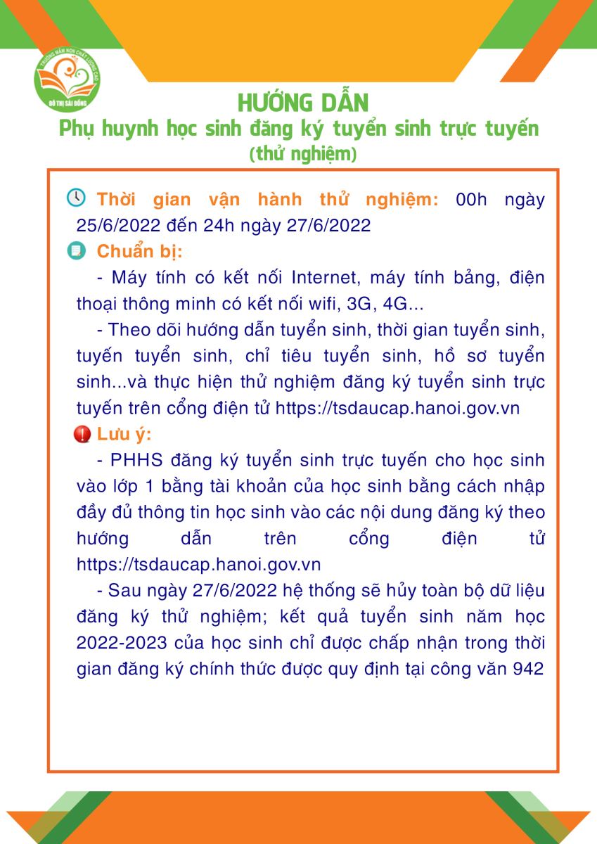 - Hướng dẫn đăng ký: PHHS đọc kỹ hướng dẫn chi tiết trước khi thực hiện đăng ký tuyển sinh cho học sinh.